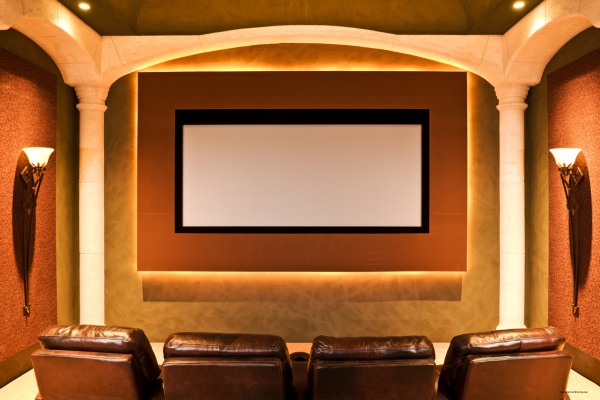 Movie nights can be scheduled in advance—lights, shades, and sound adjust automatically. The system will power on and set up the room for your chosen time